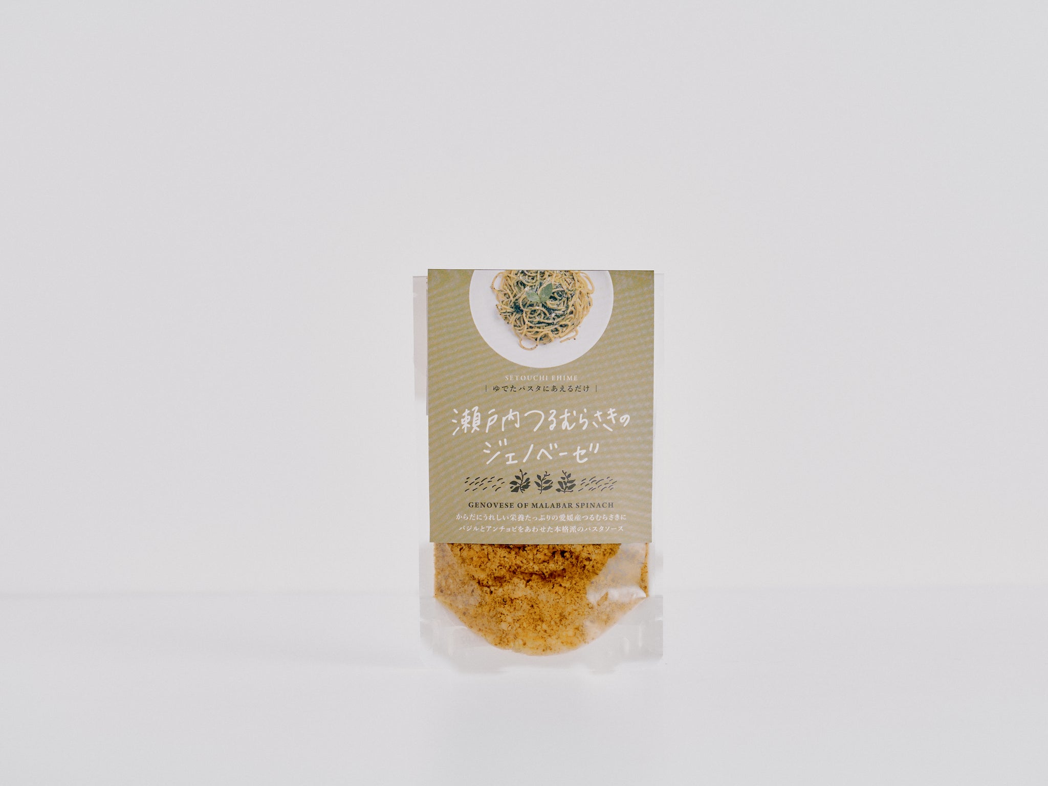 インドのほうれん草とも呼ばれる『つるむらさき』は暑い夏でも育ちやすいサステナブルな野菜。宇和島市三間地区の農家さんが手塩にかけて育てるつるむらさきの、外葉や茎も無駄なく利用しペーストに。西条産の爽やかなバジルの香りが旨味を引き立てます。温パスタは冷静パスタにも。茹でたパスタをあえるだけの手軽さで、瀬戸内イタリアンを。