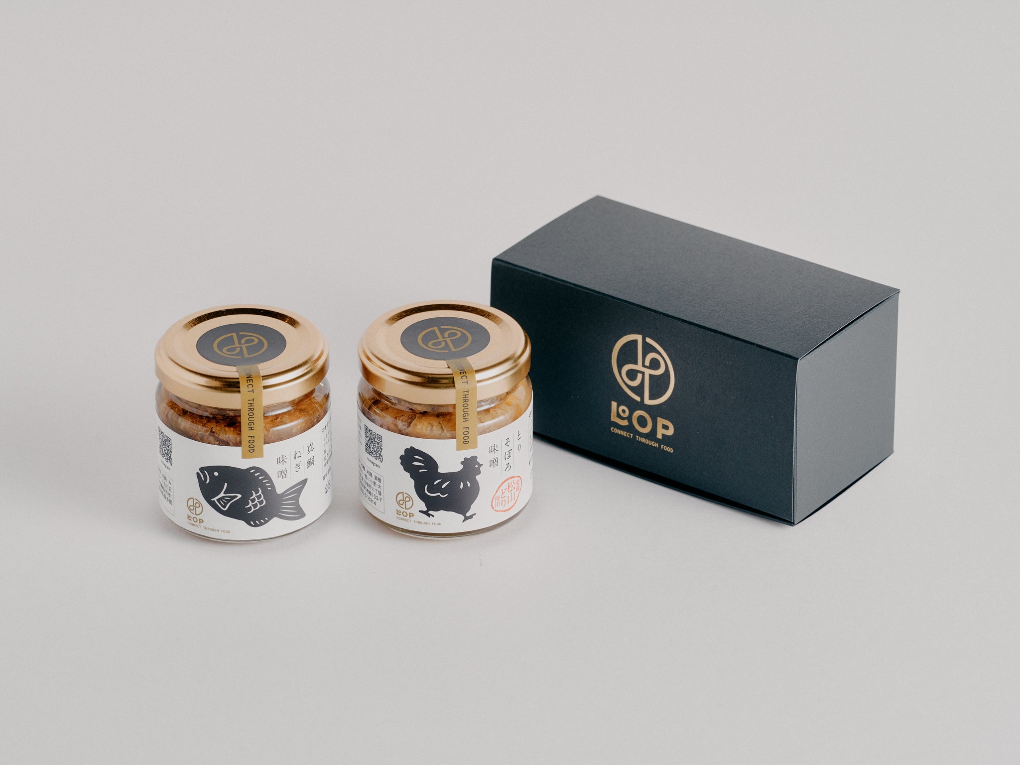 LOOPオリジナルBOXに鶏そぼろ味噌と真鯛ねぎ味噌が入ったギフトセットです。プチギフトに最適です。